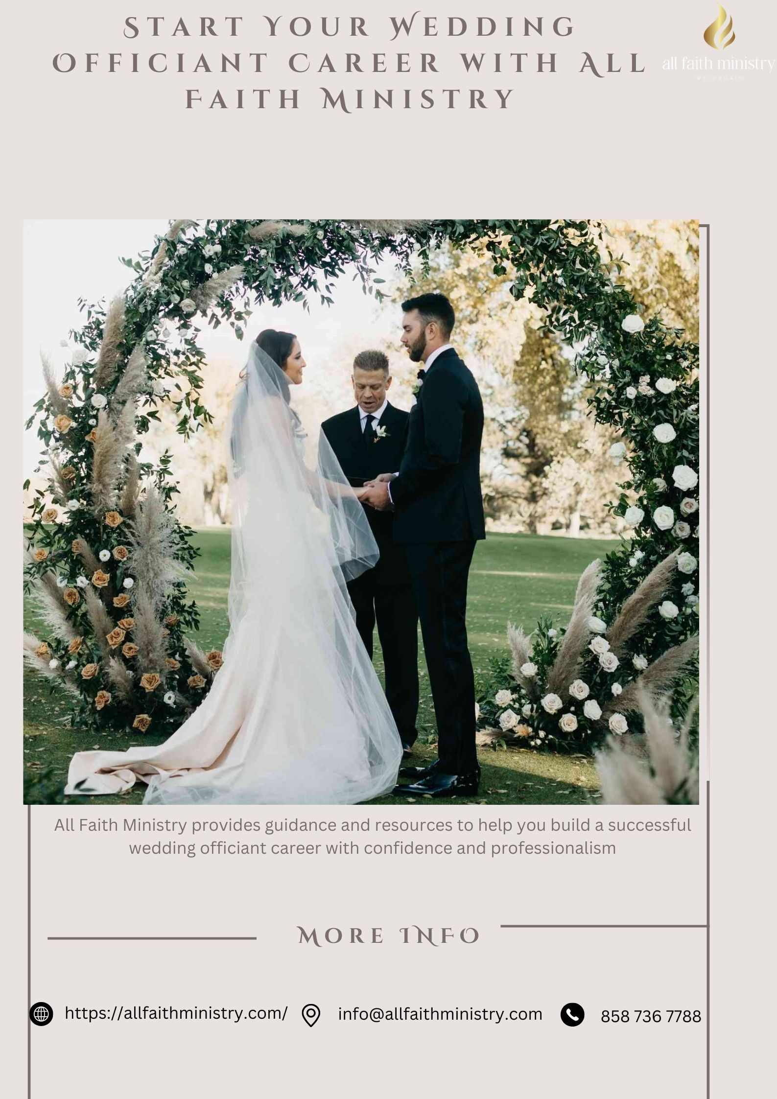 Dreaming of a wedding officiant career? All Faith Ministry helps you get started with professional training, legal guidance, and ongoing support. Learn how to craft personalized ceremonies and officiate with confidence. Join our community of officiants and start making couples’ special days even more meaningful!